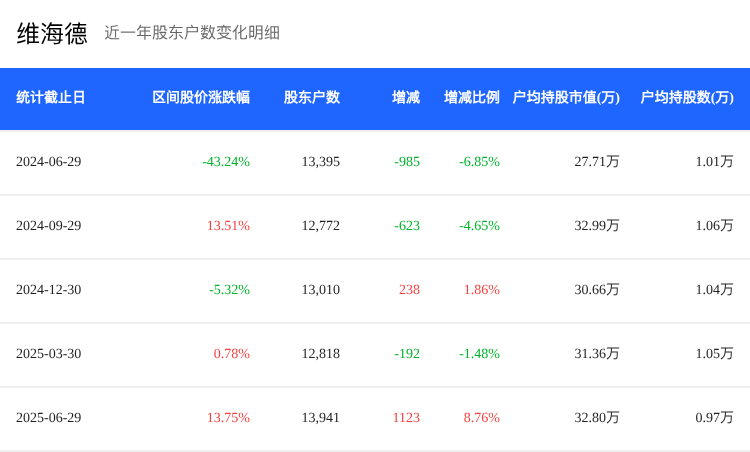从2025年3月31日至2025年6月30日,维海德的股价表现积极,实现了13.75%的涨幅。然而,日均成交量减少了11.98%,日均换手率也下降了11.86%,这表明尽管股价上涨,市场上的交易活跃度有所下降,投资者可能更加倾向于持有而非频繁交易。