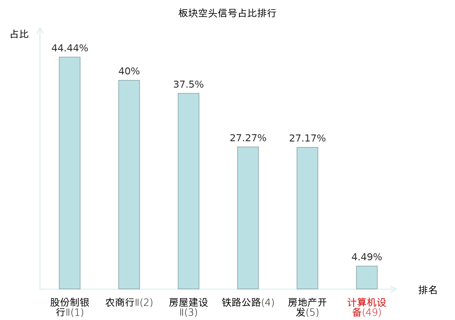 全市场所有行业板块中主力空头信号占比排名中,股份制银行Ⅱ板块位居第一。化学原料板块名次提升最快,较昨日上升118位。
