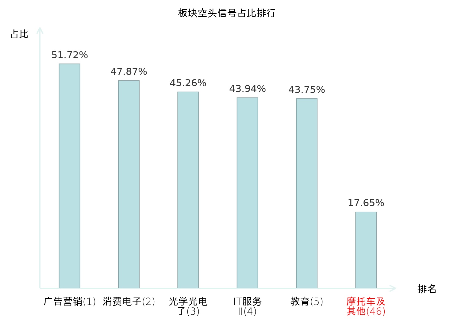 全市场所有行业板块中主力空头信号占比排名中,广告营销板块位居第一。广告营销板块名次提升最快,较昨日上升115位。