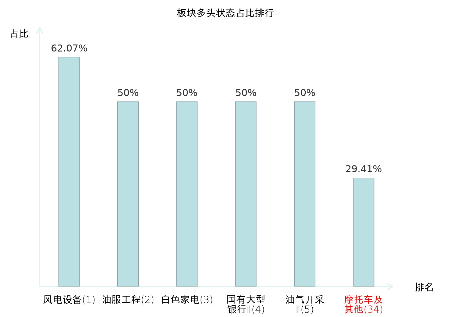 全市场所有行业板块中主力多头状态占比排名中,风电设备板块位居第一。动物保健Ⅱ板块名次提升最快,较昨日上升64位。