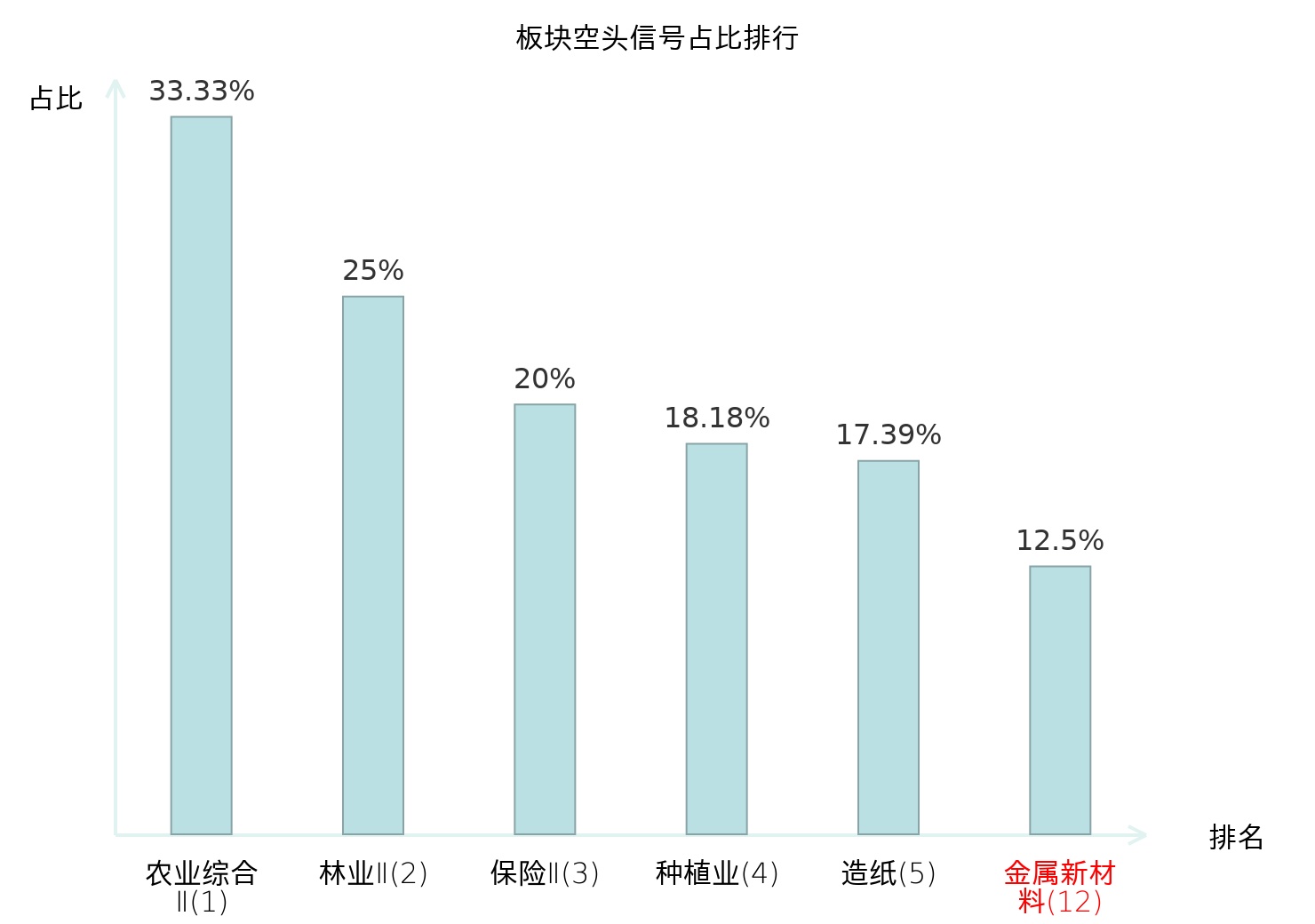 全市场所有行业板块中主力空头信号占比排名中,农业综合Ⅱ板块位居第一。炼化及贸易板块名次提升最快,较昨日上升115位。