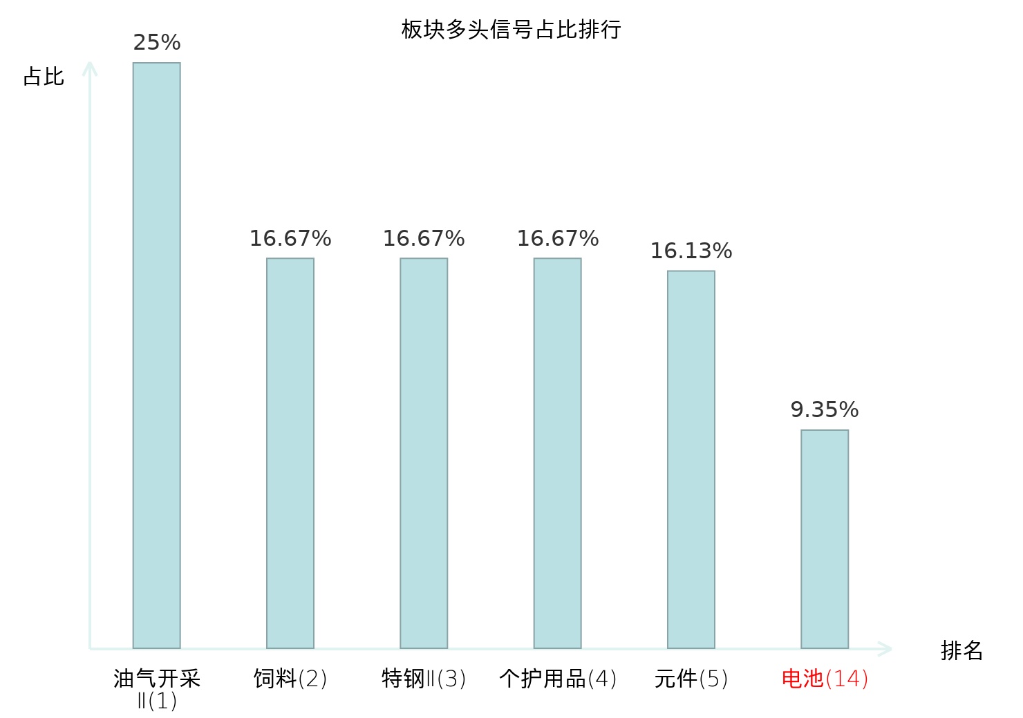 全市场所有行业板块中主力多头信号占比排名中,油气开采Ⅱ板块位居第一。个护用品板块名次提升最快,较昨日上升112位。