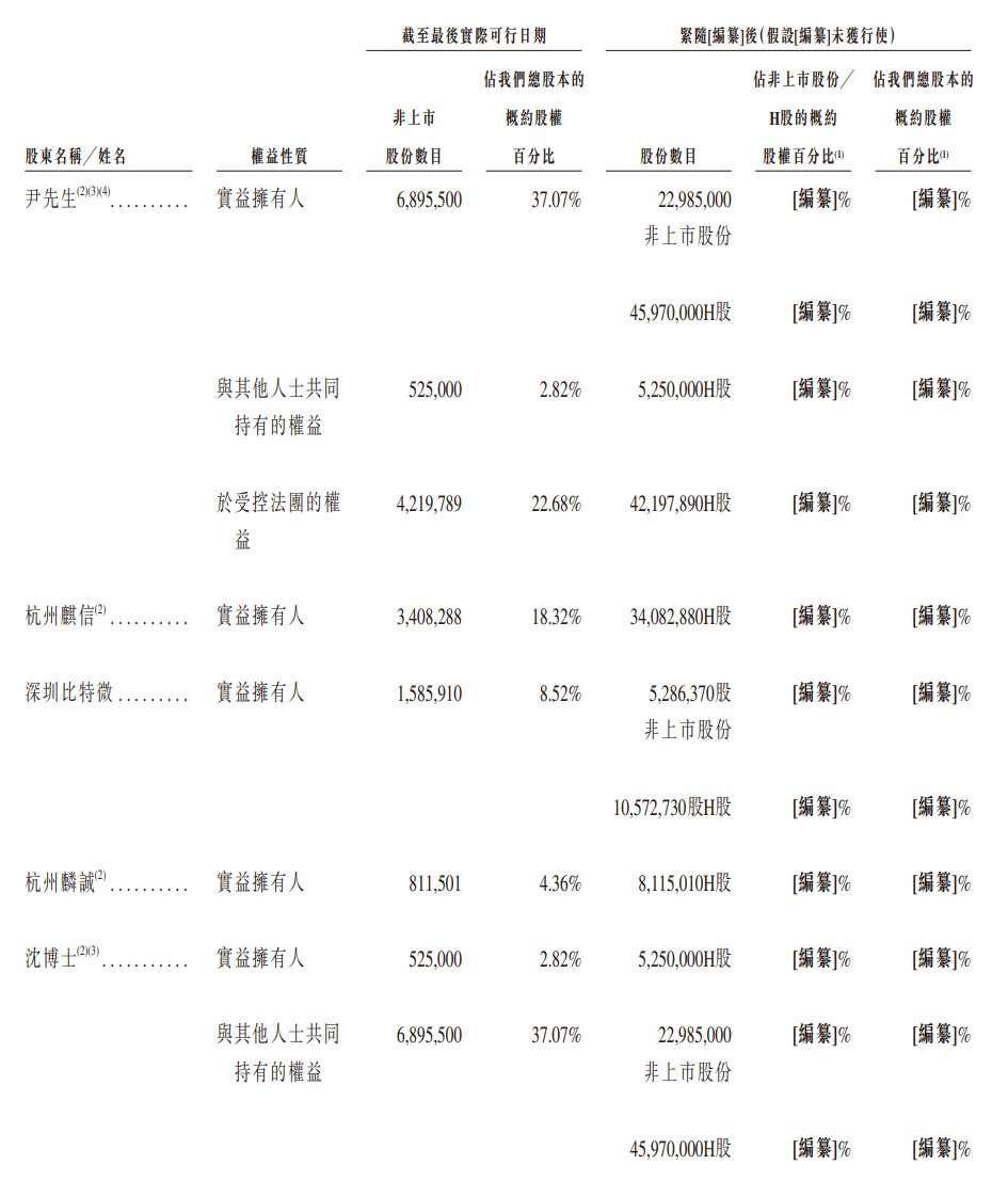公司股权中,约37.07%由尹先生直接控制、约18.32%由杭州麒信控制、约4.36%由杭州麟诚控制及约2.82%由沈博士控制。杭州麒信由尹先生(作为其唯一普通合伙人)持有6.33%,及杭州麟诚由尹先生(作为其唯一普通合伙人)持有 9.24%。作为杭州麒信及杭州麟诚的唯一普通合伙人,尹先生可于公司股东大会上控制杭州麒信及杭州麟诚的投票权。此外,尹先生与沈博士订立一致行动协议,据此,沈博士同意在公司股东大会上与尹先生一致投票。因此,尹先生、杭州麒信、杭州麟诚及沈博士于公司股东大会合共有权行使约62.57%的投票权。