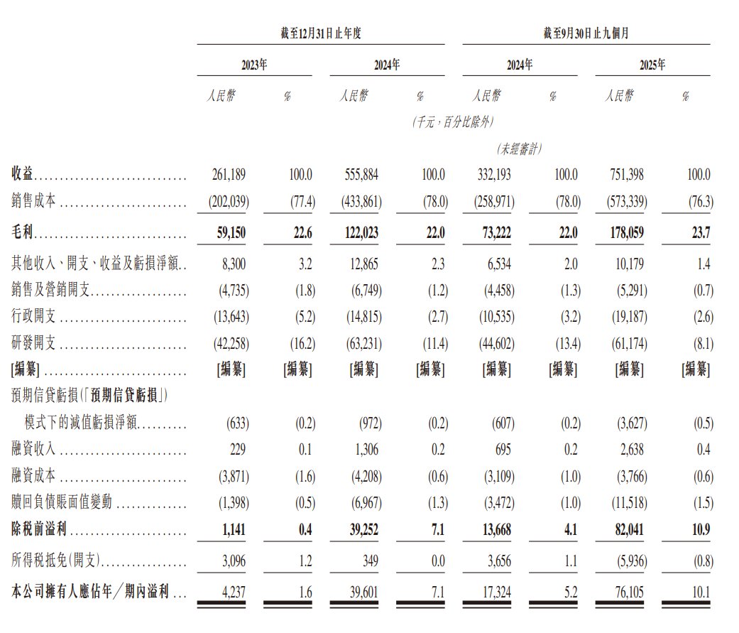 公司于2023年度、2024年度、2025年截至9月30日止九个月分别录得溢利为423.7万元、3960.1万元、7610.5万元人民币。
