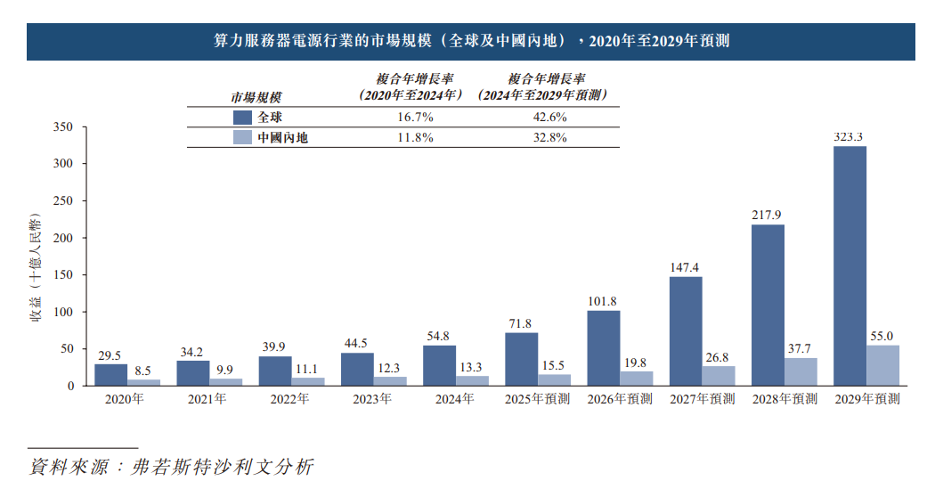 随着AI及区块链基础设施的持续建设,算力服务器电源行业经历了显著增长。于 2024年,按收益计,算力服务器电源行业的市场规模全球达到人民币548亿元及中国内地达到人民币133亿元,自2020年至2024年的复合年增长率分别为16.7%及11.8%。在算力需求进一步增长的推动下,按收益计,算力服务器电源行业的市场规模预计到2029年全球将达到人民币3233亿元,中国内地将达到人民币550亿元,自2024年至2029年的复合年增长率分别为42.6%及32.8%。
