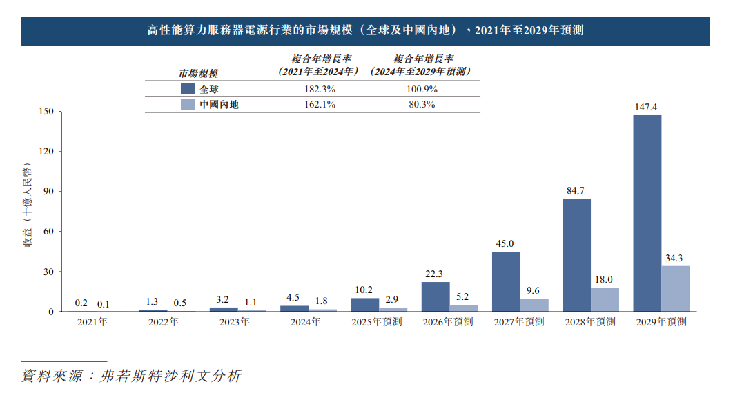 自2021年以来,AI及区块链技术经历了快速增长,众多高性能算力芯片进入市场,从而推动了对高性能算力服务器电源的新兴需求。于2024年,按收益计,高性能算力服务器电源行业的市场规模全球达到人民币45亿元及中国内地达到人民币18亿元,自2021年至2024年的复合年增长率分别为182.3%及162.1%。到2029年,按收益计,高性能算力服务器电源行业的市场规模预计全球将达到人民币1474亿元,中国内地将达到人民币343亿元,自2024年至2029年的复合年增长率分别为100.9%及80.3%。