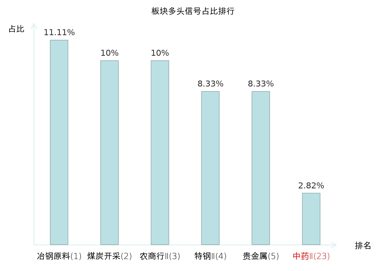 全市场所有行业板块中主力多头信号占比排名中,冶钢原料板块位居第一。冶钢原料板块名次提升最快,较昨日上升117位。