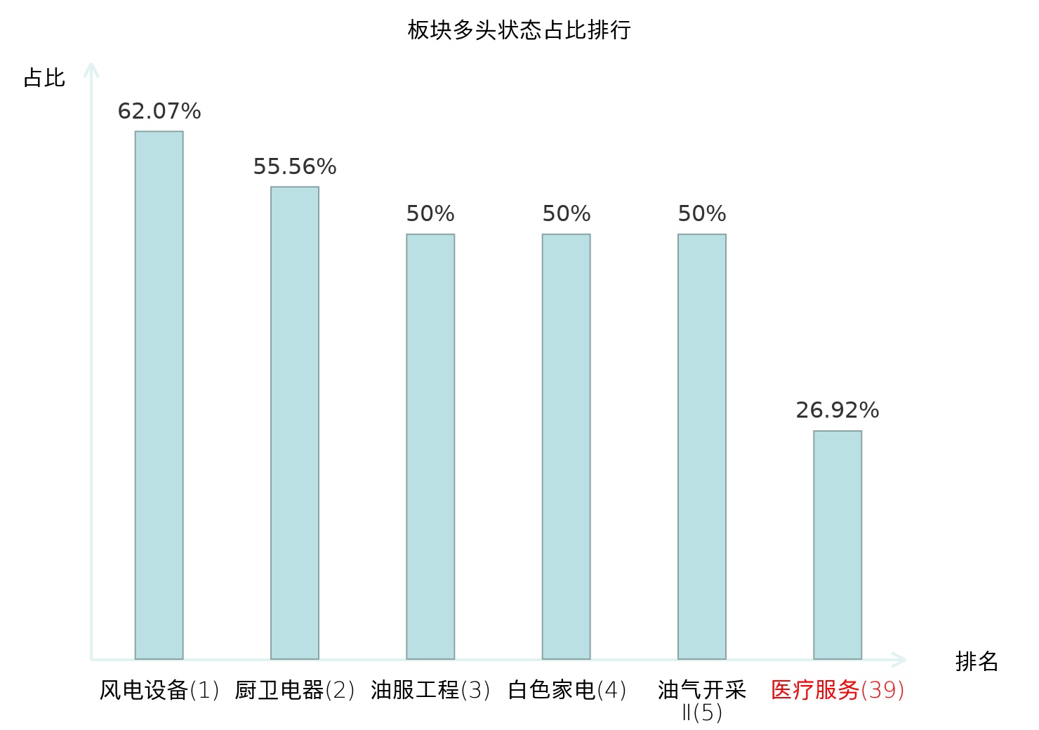 全市场所有行业板块中主力多头状态占比排名中,风电设备板块位居第一。专业连锁Ⅱ板块名次提升最快,较昨日上升65位。