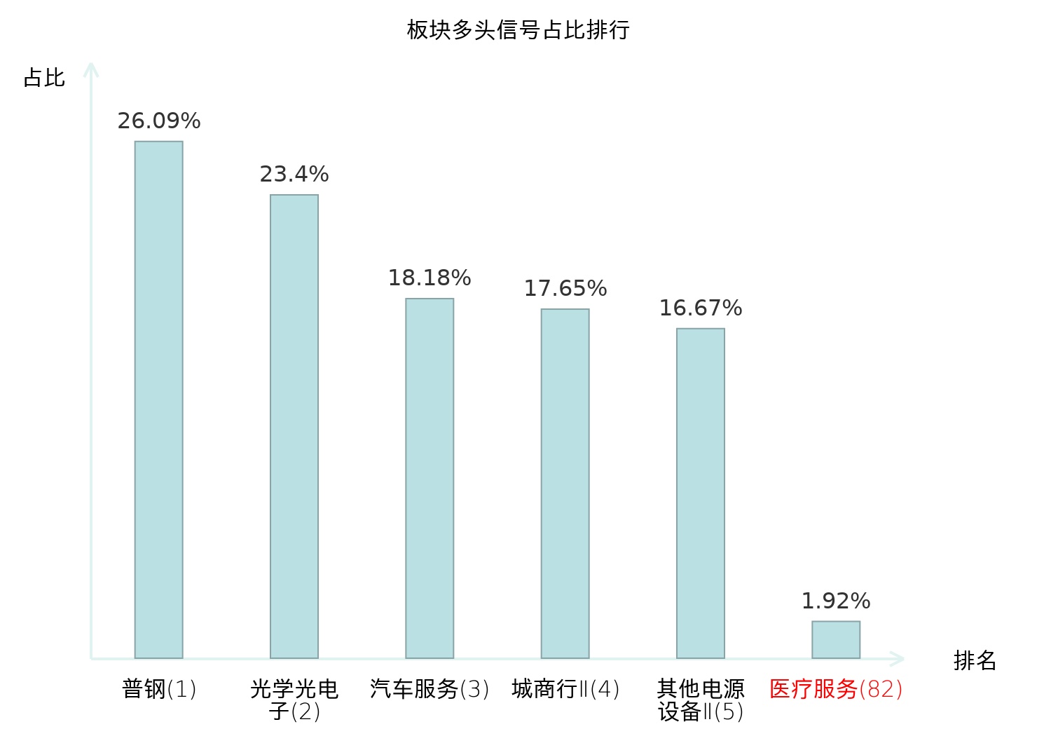 全市场所有行业板块中主力多头信号占比排名中,普钢板块位居第一。国有大型银行Ⅱ板块名次提升最快,较昨日上升116位。
