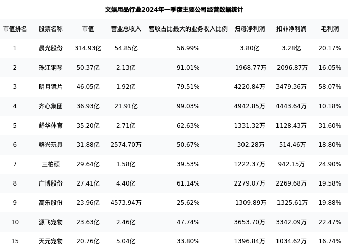 天元宠物最新报告期数据为一季度,下表汇总了文娱用品行业内市值靠前的公司一季度主要经营数据