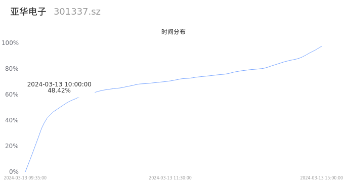 301337亚华电子2024年03月13日成交10.19万手,成交金额4.41亿元,相较昨日放量3.11万手,换手率39.13%,成交活跃。