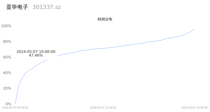 根据成交分布分析,该股票当天放量成交,成交活跃。时间上看,早盘前半小时成交量占据当天总成交量的47.46%;价格上看,成交呈现中间峰。成交分布分析主要研究股票成交的分布特性,不具有预测功能,请知悉。