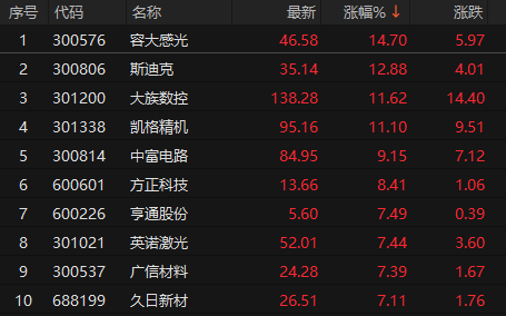 上证报中国证券网讯 1月7日早盘,PCB概念股震荡走强,截至11时12分,容大感光、斯迪克、大族数控、凯格精机涨超10%,中富电路、方正科技等跟涨。