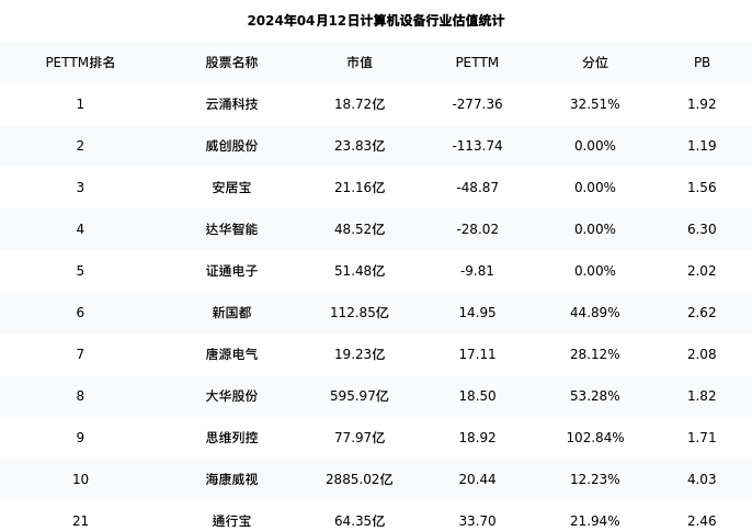 通行宝最新报告期数据为年报,下表汇总了计算机设备行业内市值靠前的公司年报主要经营数据