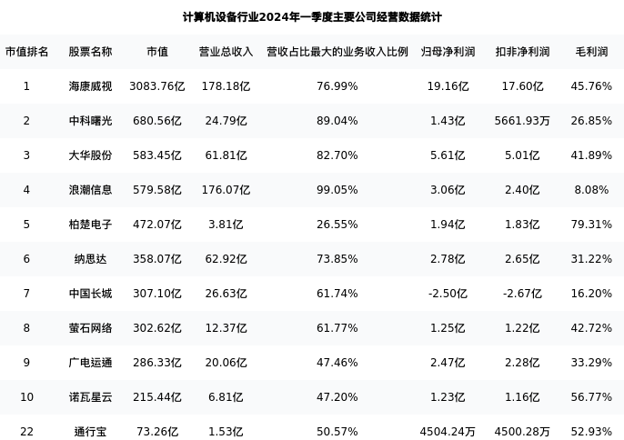 通行宝最新报告期数据为一季度,下表汇总了计算机设备行业内市值靠前的公司一季度主要经营数据