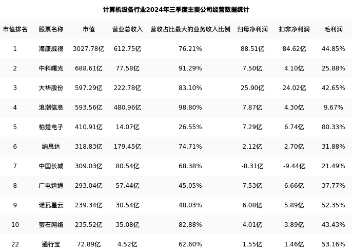 通行宝最新报告期数据为三季度,下表汇总了计算机设备行业内市值靠前的公司三季度主要经营数据