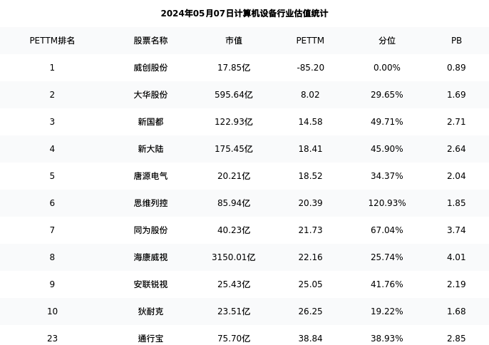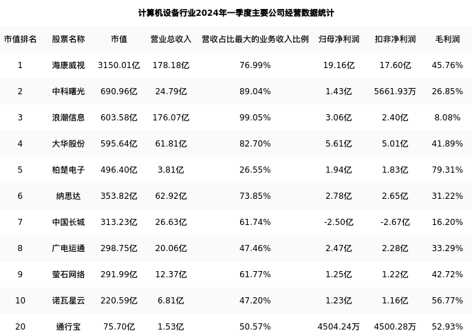通行宝最新报告期数据为一季度,下表汇总了计算机设备行业内市值靠前的公司一季度主要经营数据