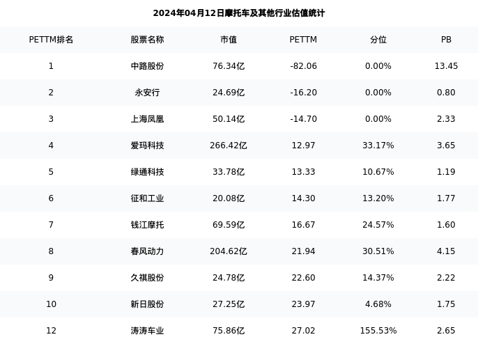 从估值角度看:涛涛车业最新市盈率PETTM为27.02,在行业内排名9/16,处于155.53分位。