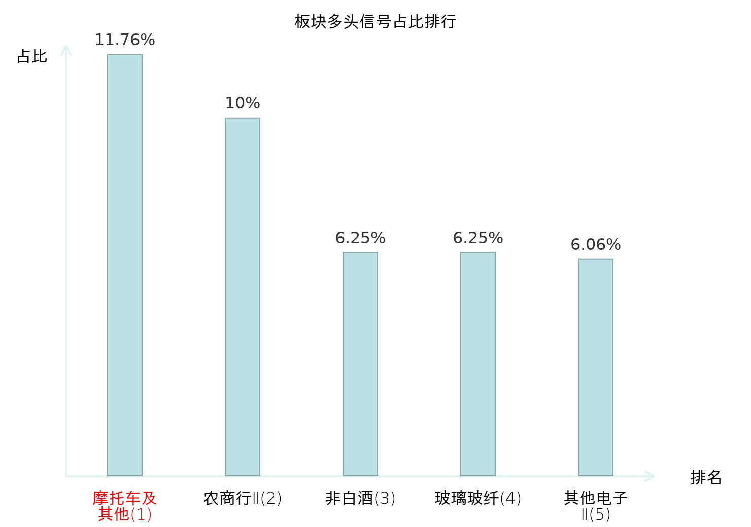 全市场所有行业板块中主力多头信号占比排名中,摩托车及其他板块位居第一。摩托车及其他板块名次提升最快,较昨日上升91位。