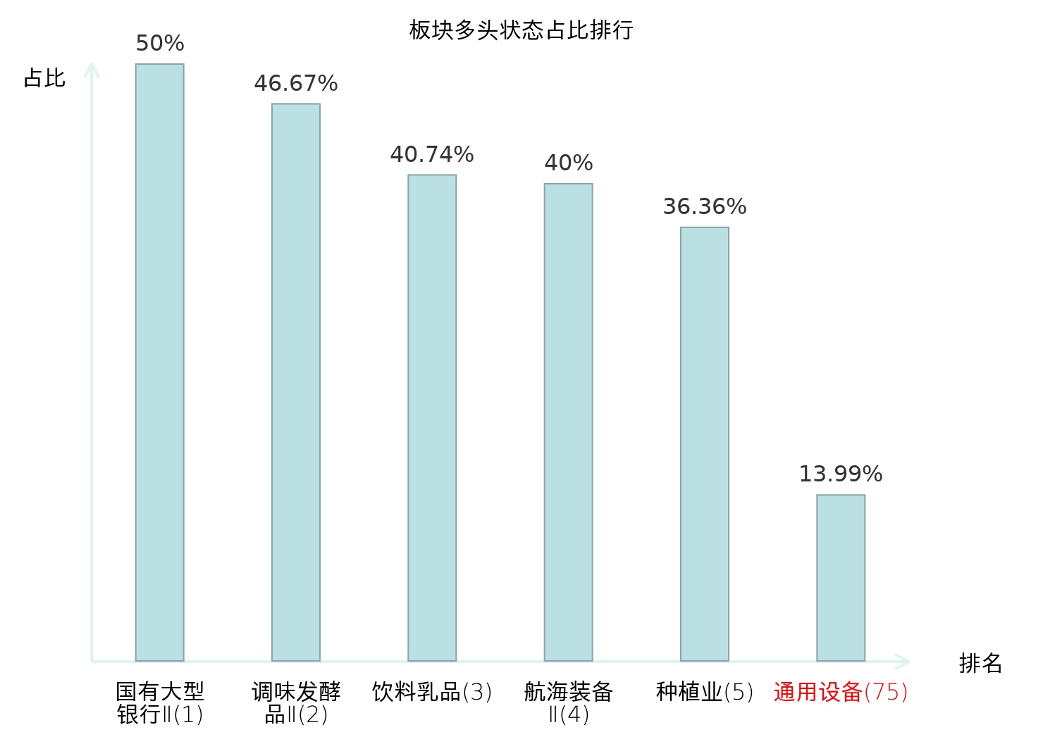 全市场所有行业板块中主力多头状态占比排名中,国有大型银行Ⅱ板块位居第一。金属新材料板块名次提升最快,较昨日上升71位。