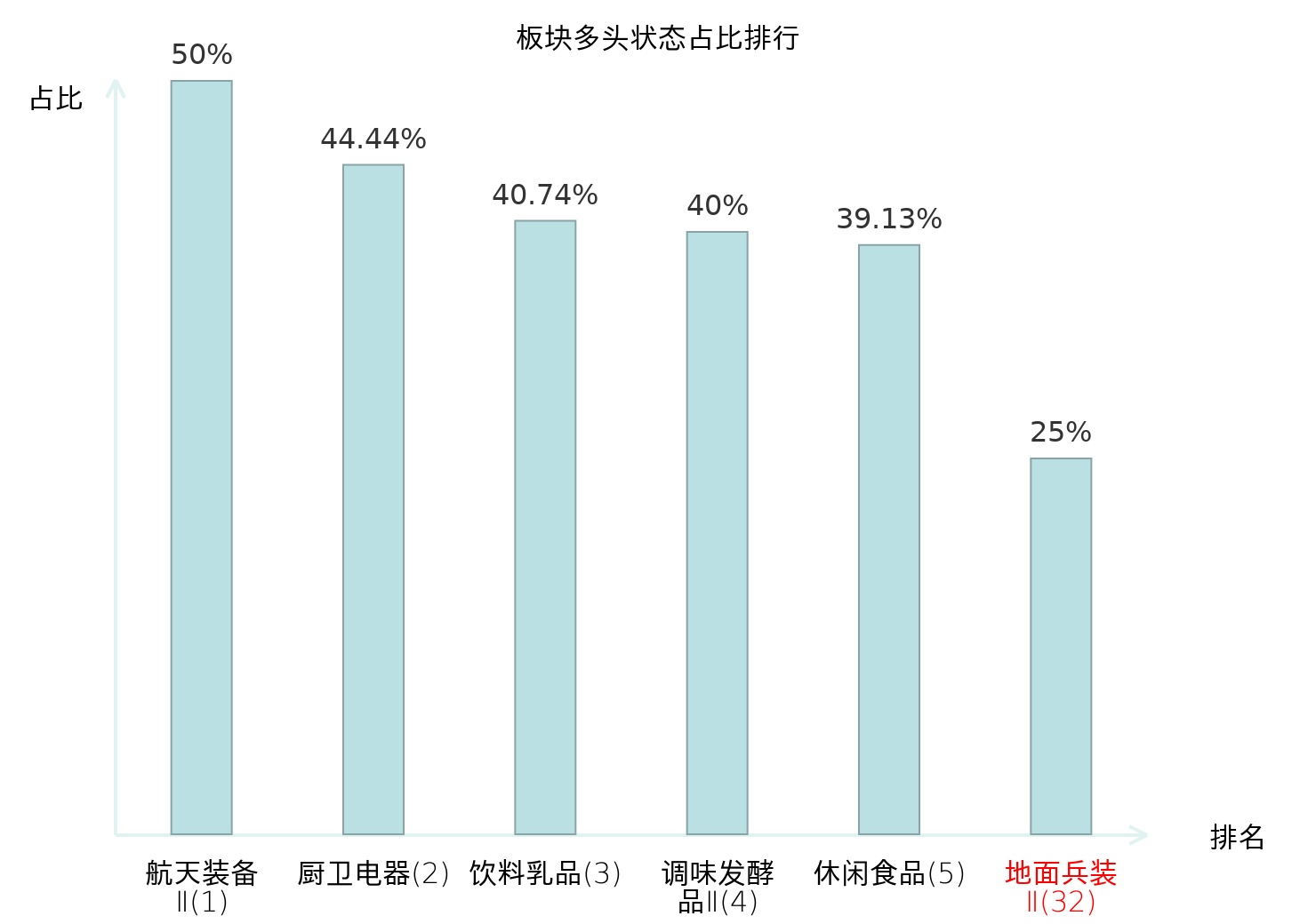 全市场所有行业板块中主力多头状态占比排名中,航天装备Ⅱ板块位居第一。林业Ⅱ板块名次提升最快,较昨日上升92位。