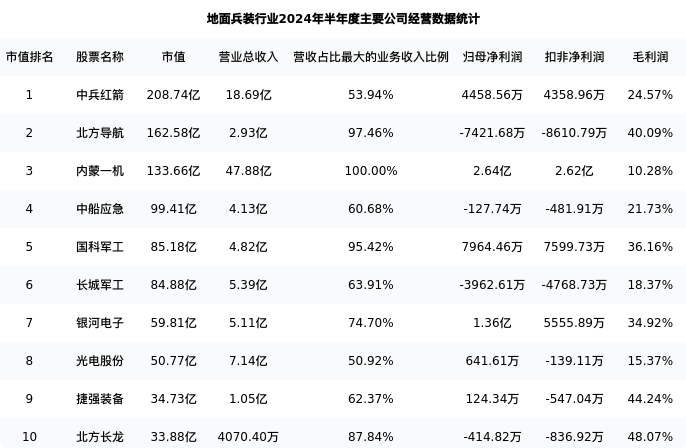 北方长龙最新报告期数据为半年度,下表汇总了地面兵装行业内市值靠前的公司半年度主要经营数据