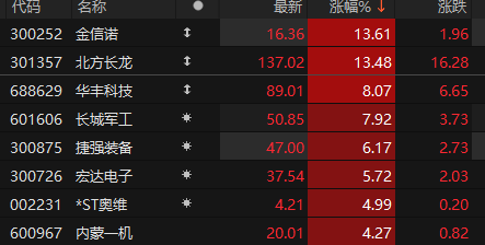 上证报中国证券网讯 9月12日午后,国防军工板块异动拉升。截至13时46分,金信诺、北方长龙涨超13%,华丰科技涨逾8%,长城军工、捷强装备等跟涨。