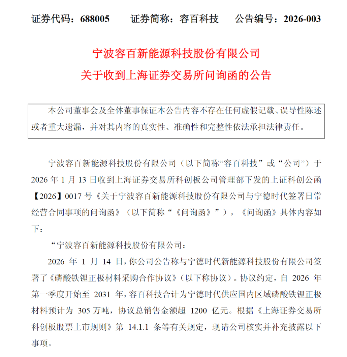 上交所问询函关注到,下发问询函当天容百科技公告与宁德时代签署了《磷酸铁锂正极材料采购合作协议》。协议约定,自2026年第一季度开始至2031年,容百科技合计为宁德时代供应国内区域磷酸铁锂正极材料预计为305万吨,协议总销售金额超1200亿元。