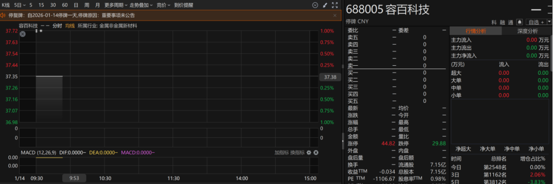 上证报中国证券网讯1月13日深夜,容百科技(688005)收到上海证券交易所问询函,并在1月14日临时停牌。根据问询函,容百科技需在1个交易日内回复问询函问题。Choice提示,容百科技自2026年1月14日停牌一天,停牌原因为重要事项未公告。