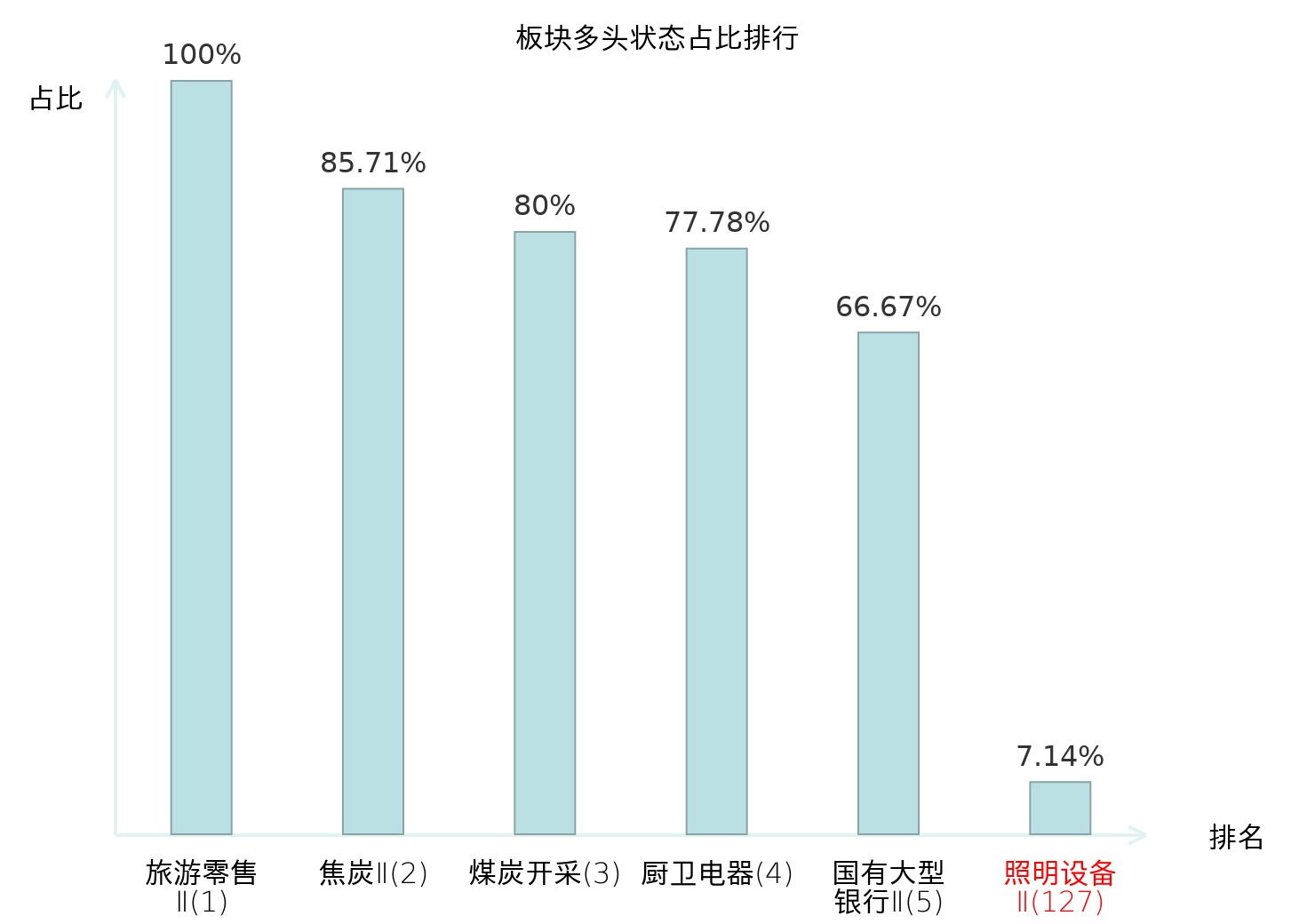 全市场所有行业板块中主力多头状态占比排名中,旅游零售Ⅱ板块位居第一。渔业板块名次提升最快,较昨日上升66位。