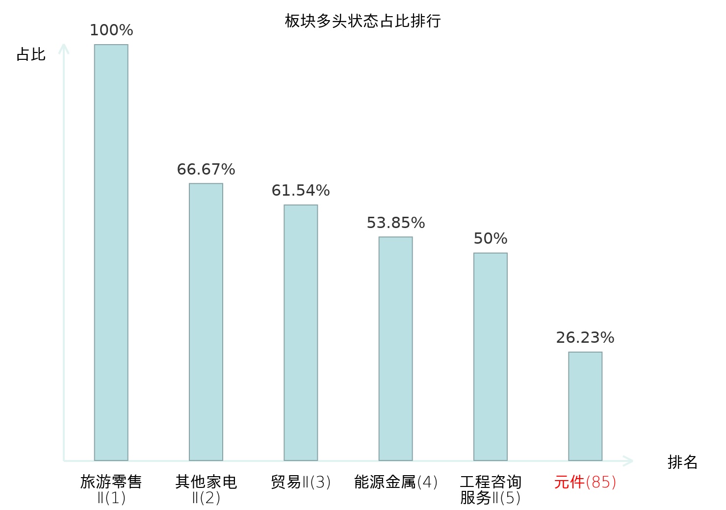 从主力宝信号数据分析,一博科技所属的元件板块中有16只股票处于主力多头状态,主力多头状态占比在全行业中排名第85位,较昨日上升了9位。较高的排名表明主力对元件板块的整体看多意愿较强,而此次排名的上升可能反映了主力对这一板块态度的进一步积极。全市场所有行业板块中,旅游零售Ⅱ板块的主力多头状态占比最高,位居第一;冶钢原料板块的名次提升最快,较昨日上升了37位。这些变动揭示了不同行业间主力资金动向的趋势,为投资者提供了关于市场情绪和潜在投资机会的重要线索。