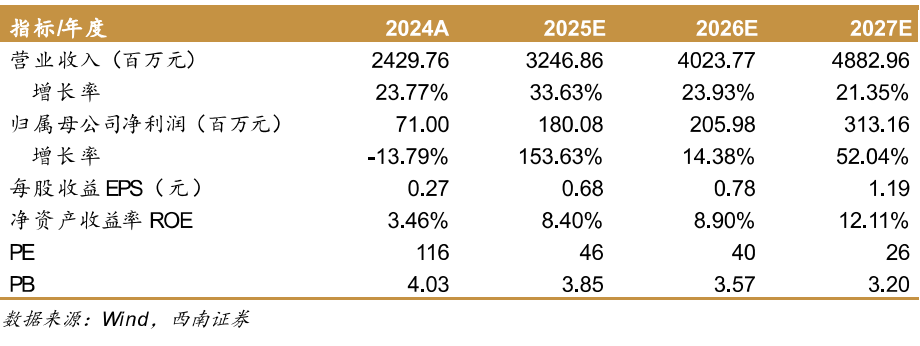 预计公司2025-2027年归母净利润分别为1.8、2.1、3.1亿元,未来三年归母净利润复合增速为64%。考虑公司新能源领域产品具备显著竞争优势,非道路车辆、低空经济、关节模组等新领域快速拓展,打开成长空间,维持“买入”评级。