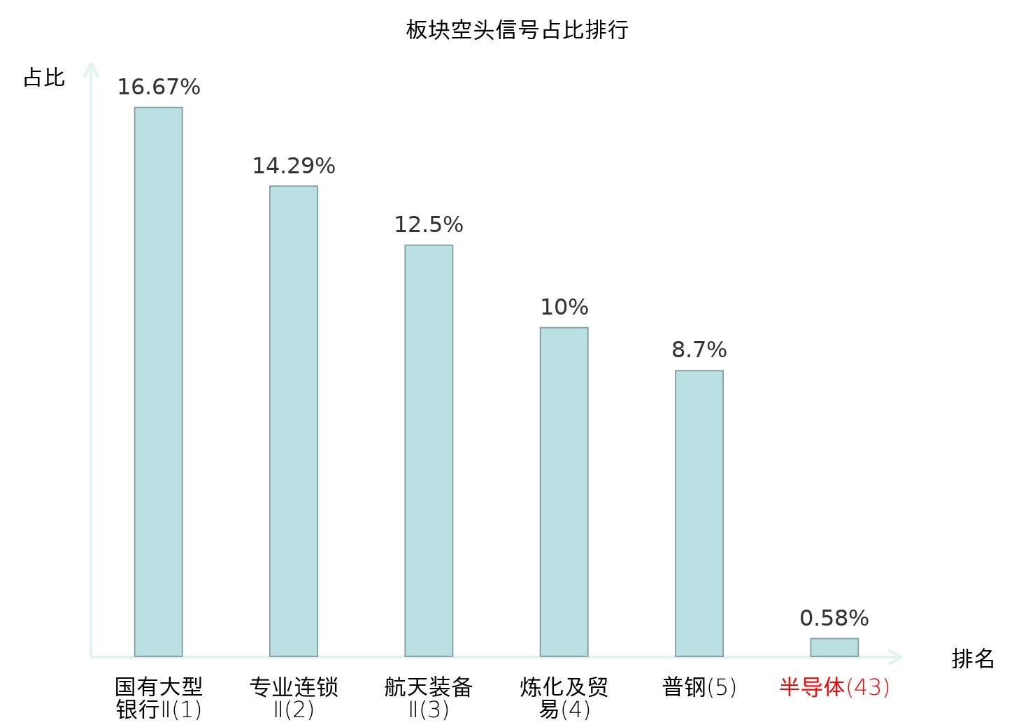 全市场所有行业板块中主力空头信号占比排名中,国有大型银行Ⅱ板块位居第一。食品加工板块名次提升最快,较昨日上升103位。