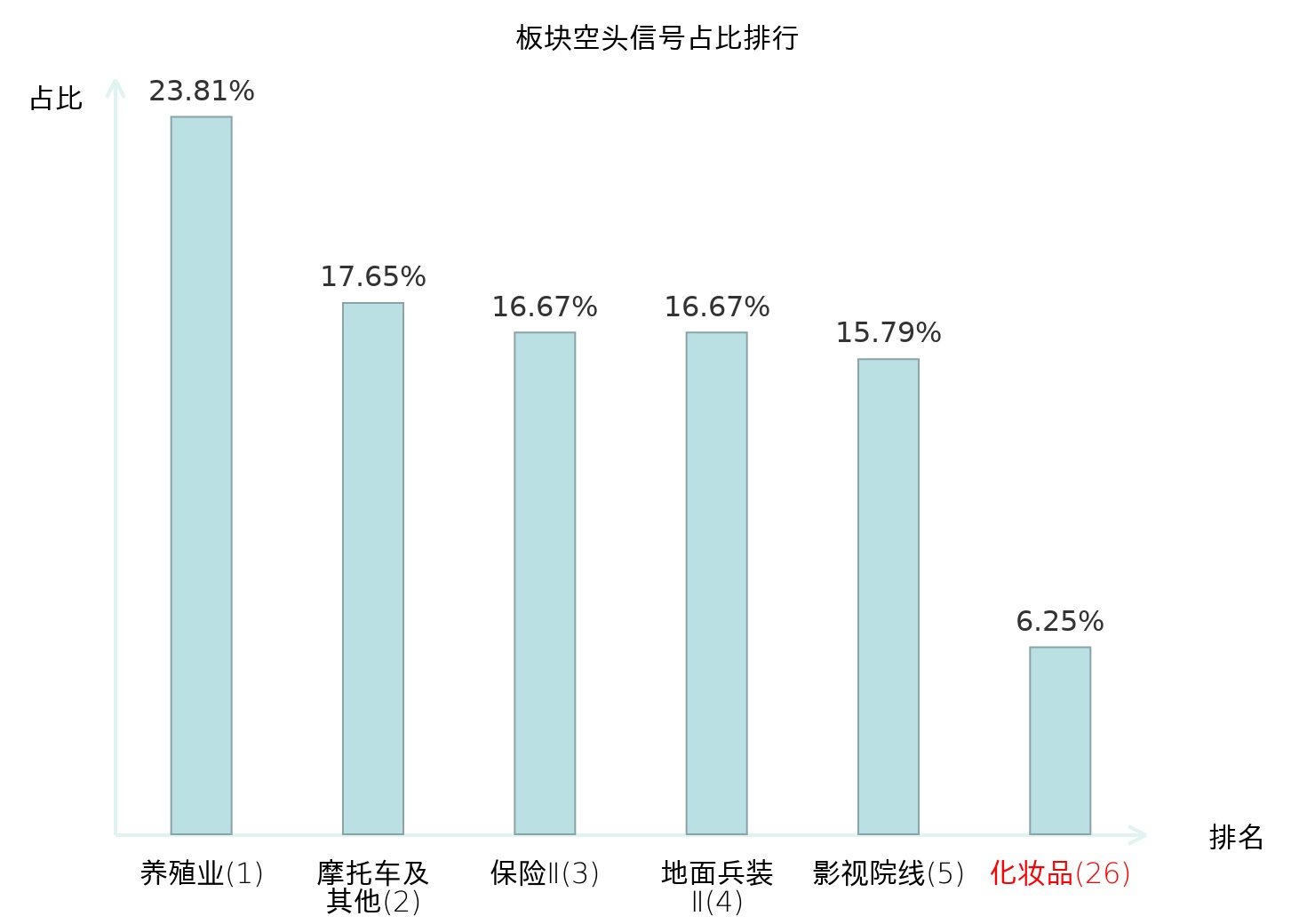 全市场所有行业板块中主力空头信号占比排名中,养殖业板块位居第一。养殖业板块名次提升最快,较昨日上升114位。