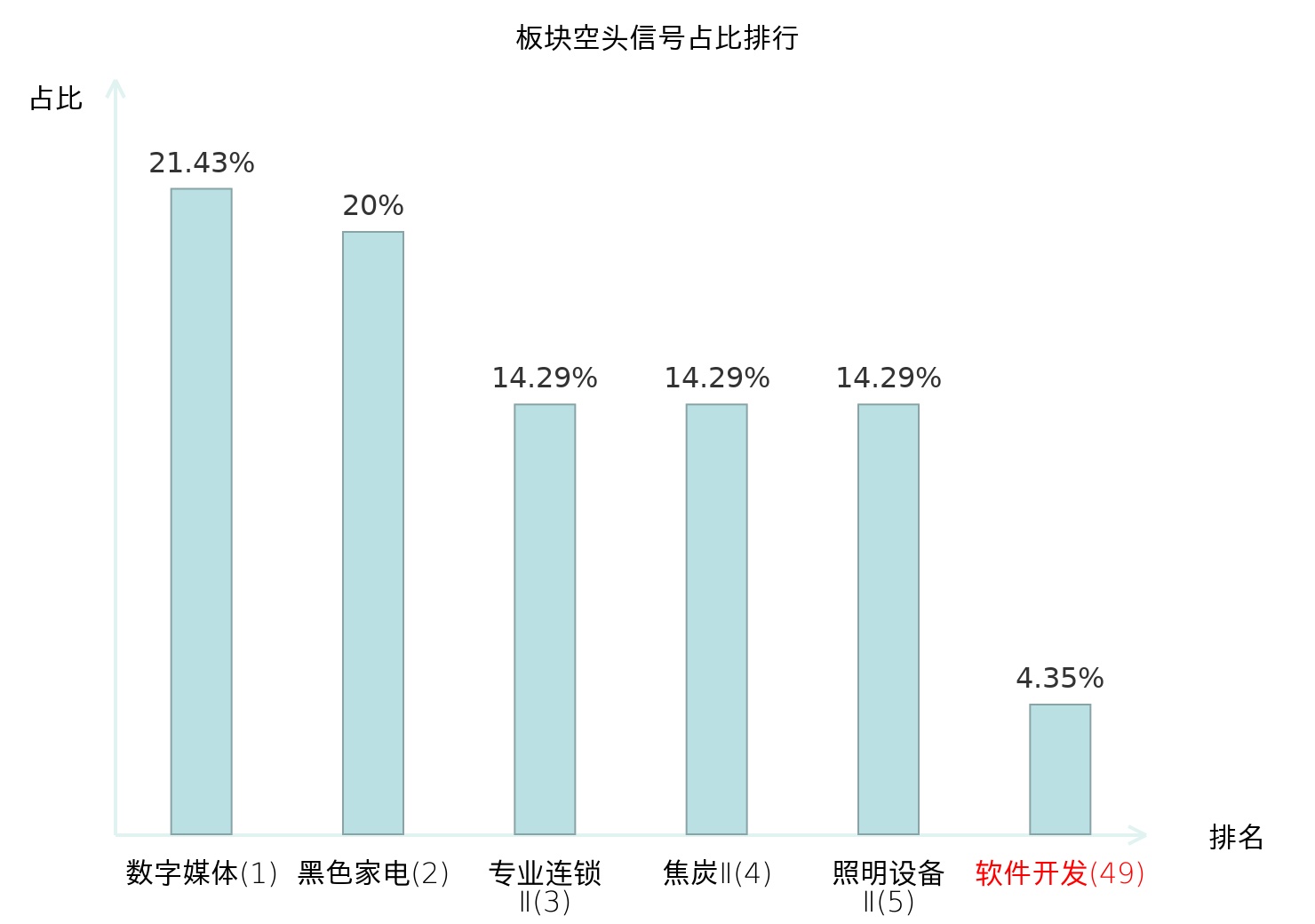 从主力宝信号数据分析,通达海所属的软件开发板块中共6只股票发出主力空头信号,主力空头信号占比在全行业中排名第49位,较昨日下降29位;排名越高说明主力当日卖出意愿越强;此次排名下降表明主力对该板块整体卖出意愿有所减弱。全市场所有行业板块中主力空头信号占比排名中,数字媒体板块位居第一;装修装饰Ⅱ板块名次提升最快,较昨日上升110位;这些变动反映了不同行业间主力资金行为的分化,为投资者评估市场压力分布及潜在风格切换提供了客观依据。