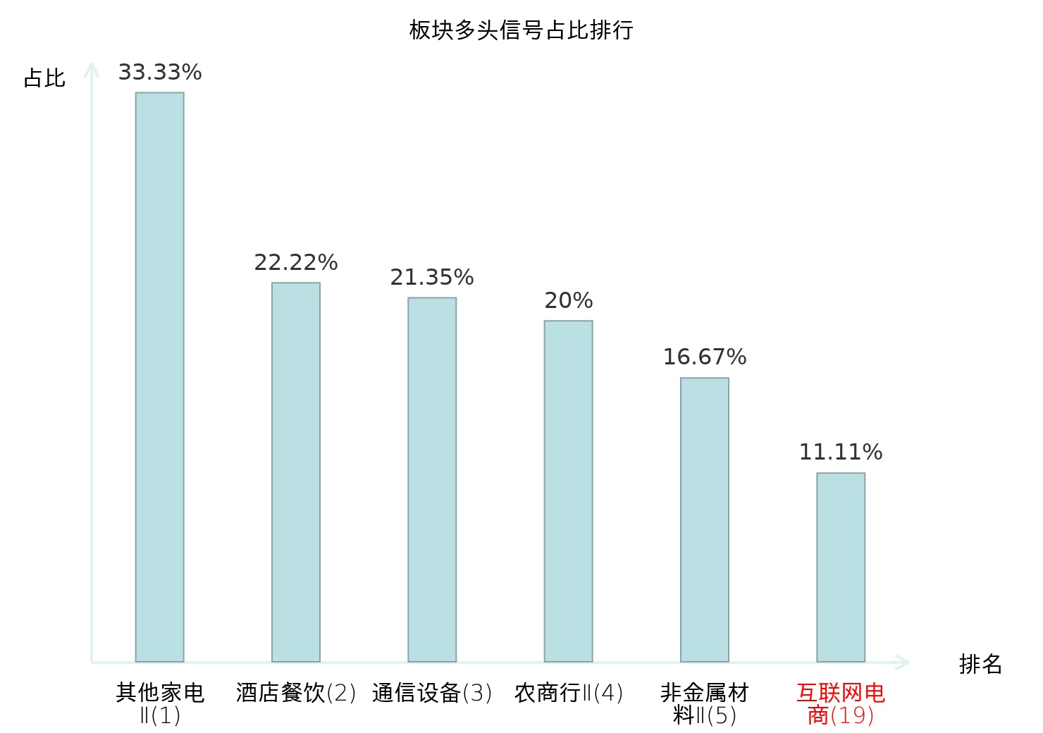 全市场所有行业板块中主力多头信号占比排名中,其他家电Ⅱ板块位居第一。其他家电Ⅱ板块名次提升最快,较昨日上升128位。