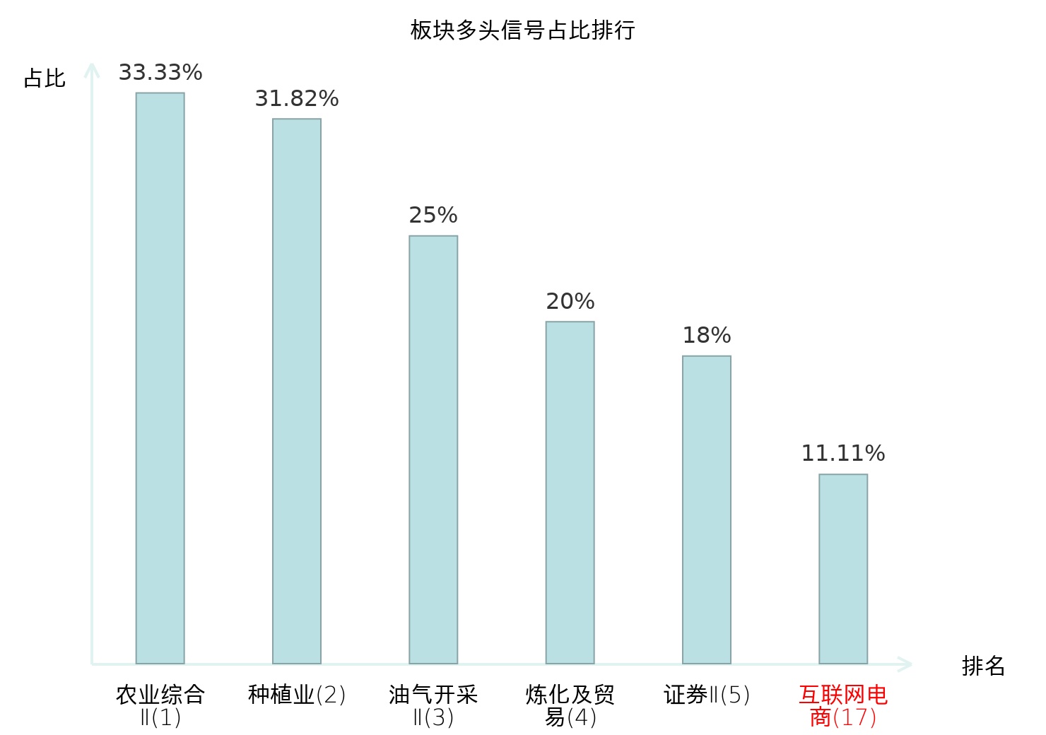 全市场所有行业板块中主力多头信号占比排名中,农业综合Ⅱ板块位居第一。农业综合Ⅱ板块名次提升最快,较昨日上升127位。