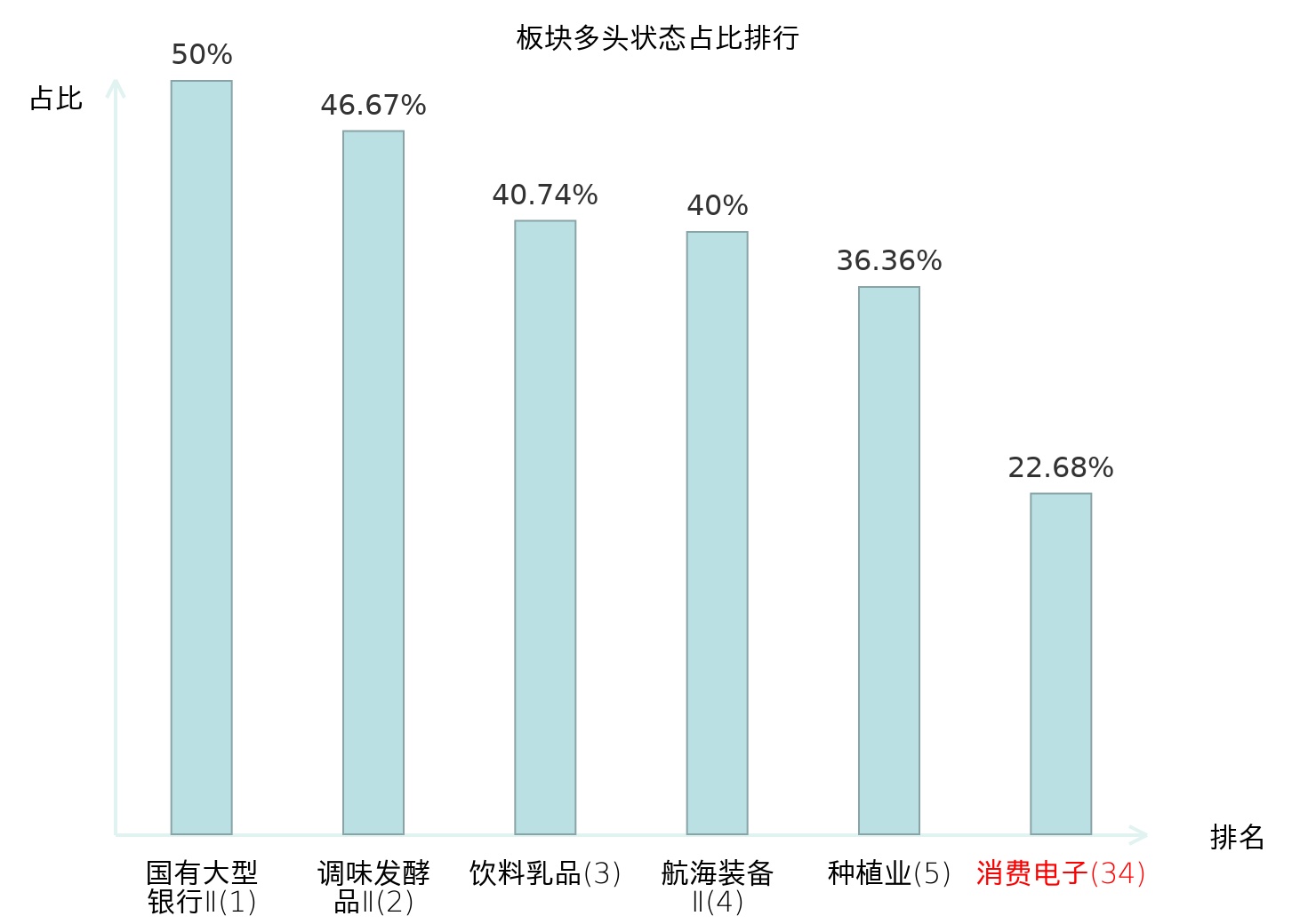 全市场所有行业板块中主力多头状态占比排名中,国有大型银行Ⅱ板块位居第一。金属新材料板块名次提升最快,较昨日上升71位。