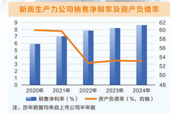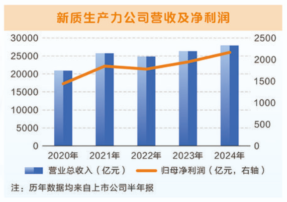 数据显示,新质生产力公司2024年上半年实现总营收2.79万亿元,同比增长6.06%;归母净利润2168.62 亿元,同比增长11.58%,而同期A股公司整体营收和净利润同比均有所下降,反映出新质生产力已转化为引领企业逆势增长的新动能。
