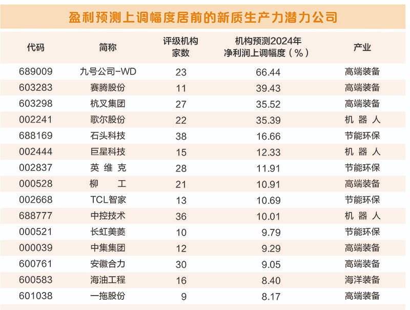 数据显示,在上述四大进入增长周期的新质生产力细分产业指数成份公司中,15家公司机构关注度较高,均被8家以上券商研报覆盖;且在半年报发布后获券商分析师上调全年预测净利润幅度超8%(被多家机构同时上调净利润预测的个股只保留调整幅度最大的样本)。