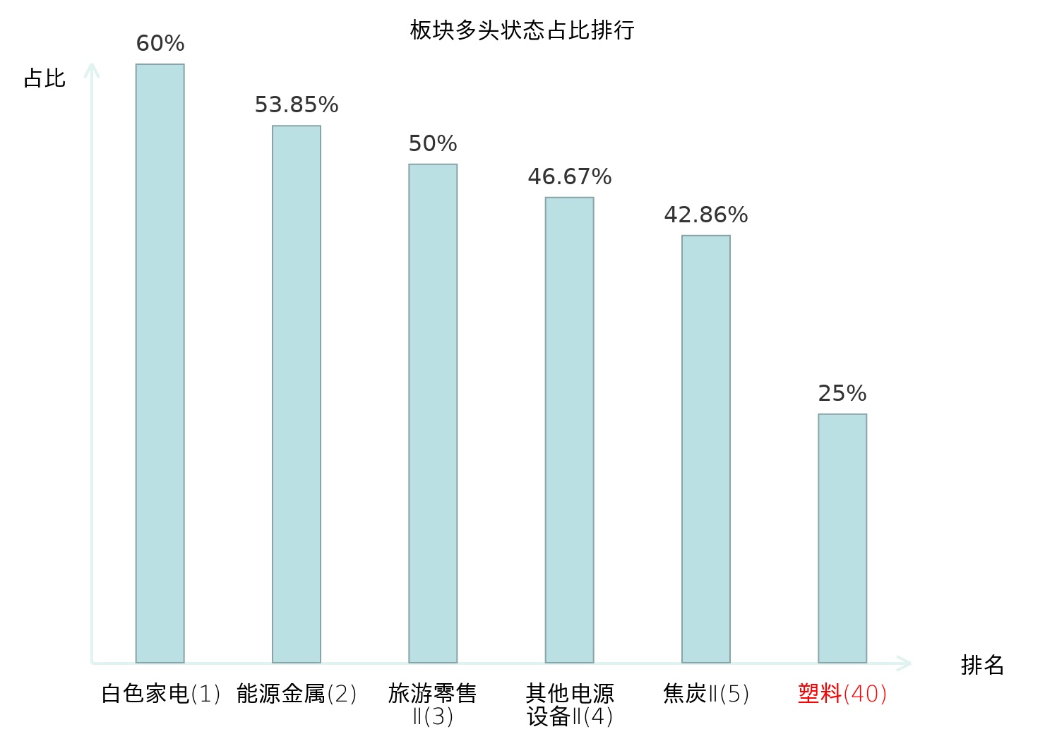 全市场所有行业板块中主力多头状态占比排名中,白色家电板块位居第一。油服工程板块名次提升最快,较昨日上升87位。