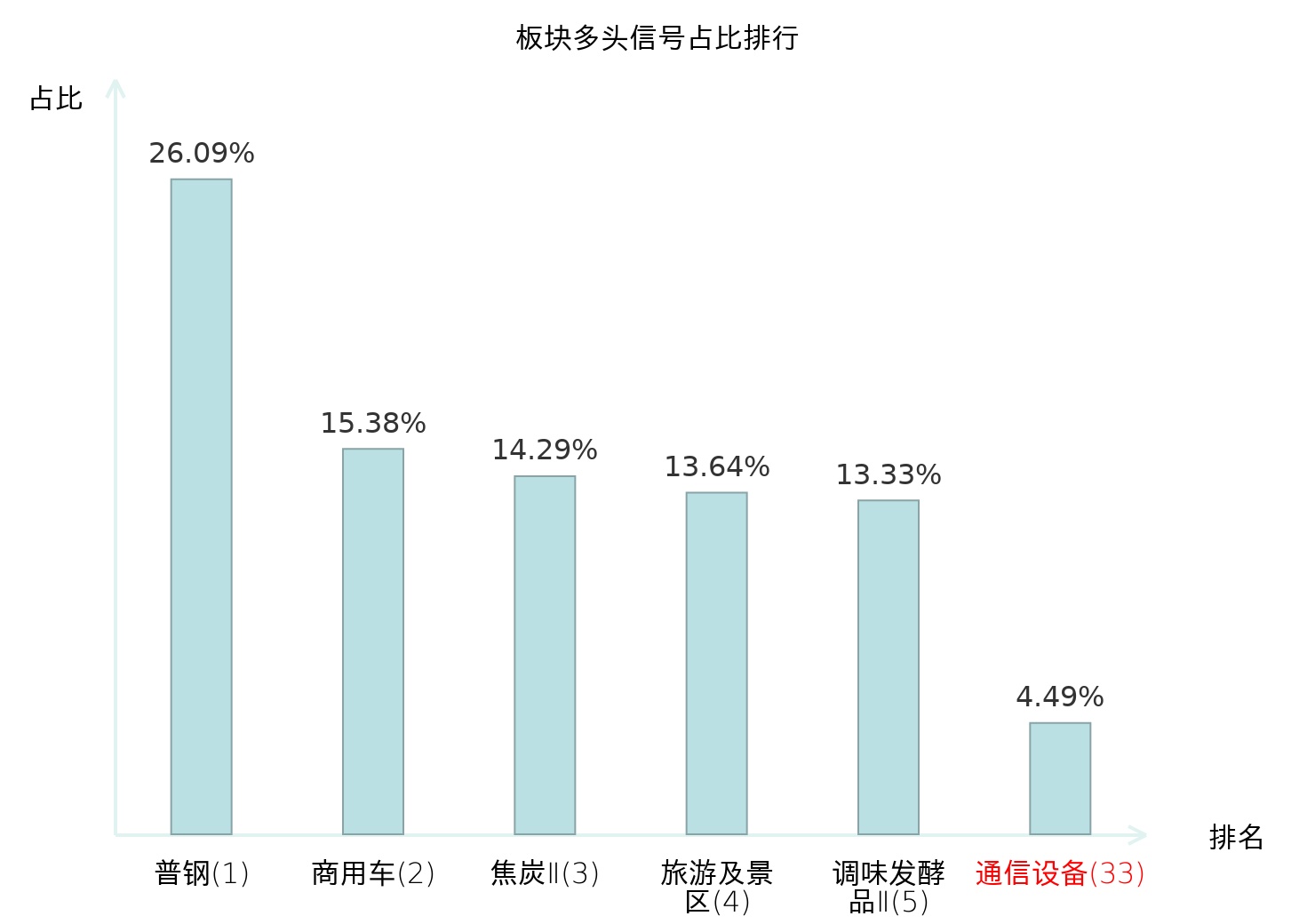 全市场所有行业板块中主力多头信号占比排名中,普钢板块位居第一。焦炭Ⅱ板块名次提升最快,较昨日上升119位。