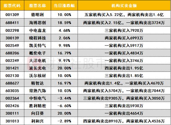 今日龙虎榜机构活跃度较高,买入方面,3连板芯片股德明利获五家机构买入5.22亿,但遭两家机构卖出1.6亿。另一只涨停的半导体概念股凯美特气获机构买入5917万。