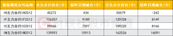 四大期指主力合约中,IF、IC、IM合约多空双方均加仓,IM合约空头加仓数量较多,IM、IF多头加仓数量较多。