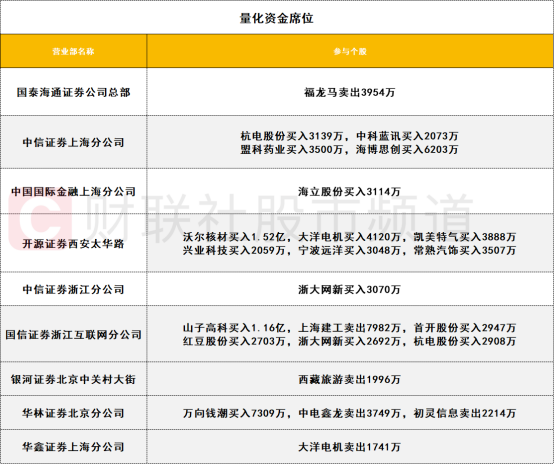 量化资金活跃度较高,高位人气股山子高科获一家量化席位买入1.16亿。涨停的沃尔核材获一家量化席位买入1.52亿。
