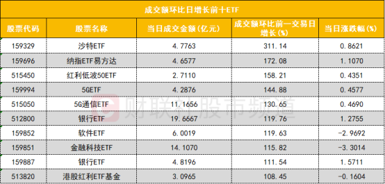 从成交额环比增长前十的ETF来看,沙特ETF(159329)成交额环比增长311%位居首位;纳指ETF易方达(159696)成交额环比增长172%位居次席。