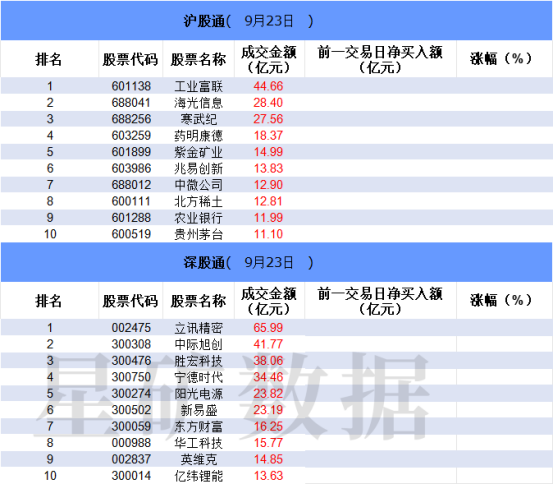 从沪股通前十大成交个股来看,工业富联位居首位;海光信息和寒武纪分居二、三位。