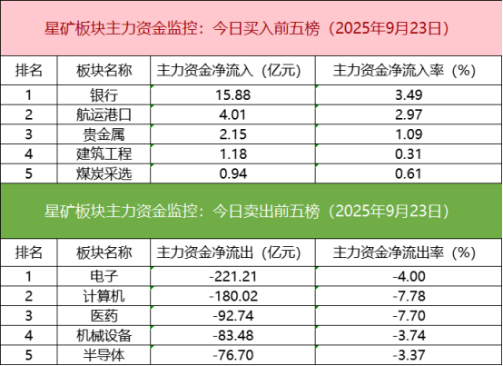 从主力板块资金监控数据来看,银行板块主力资金净流入居首。