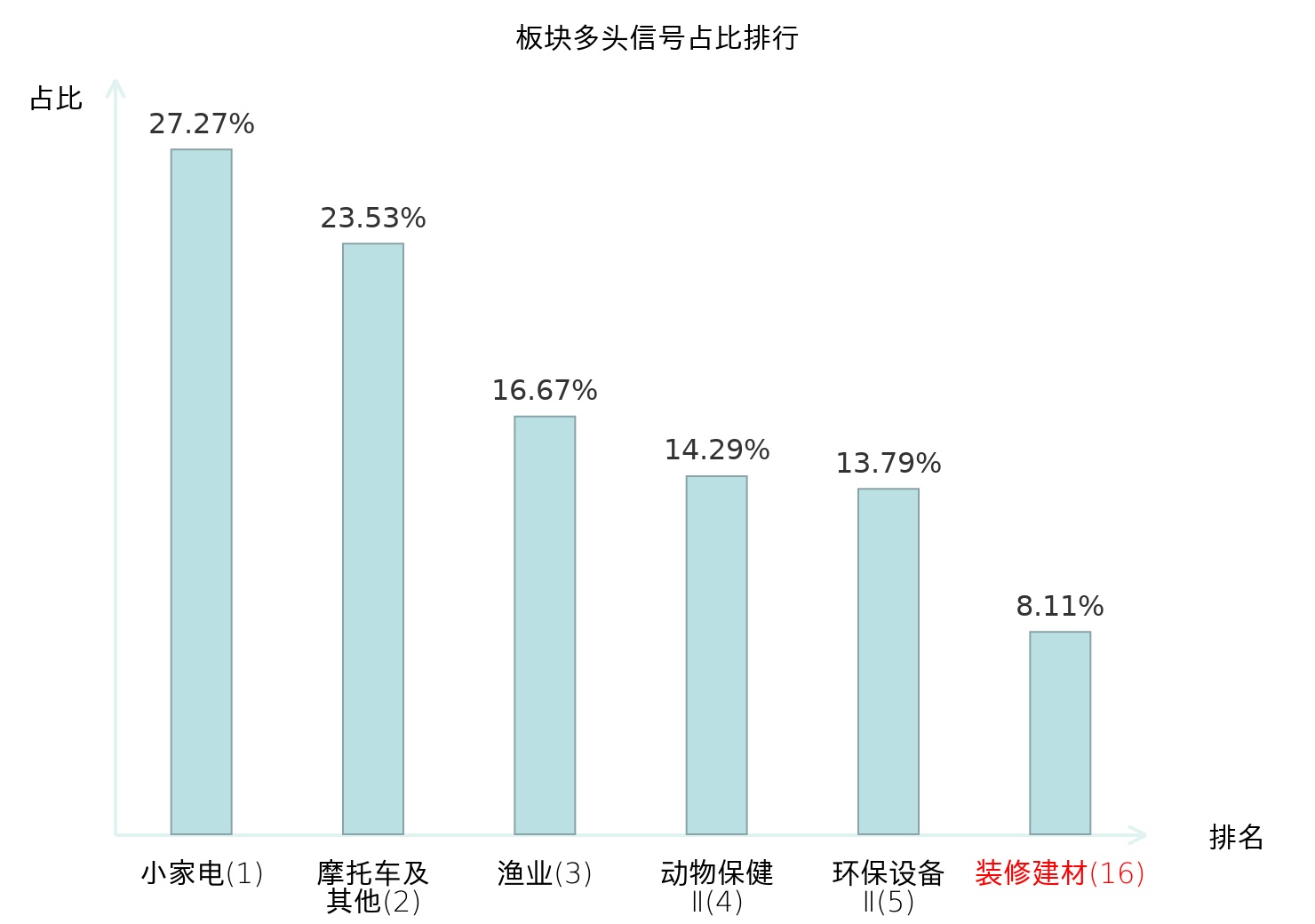 全市场所有行业板块中主力多头信号占比排名中,小家电板块位居第一。渔业板块名次提升最快,较昨日上升122位。