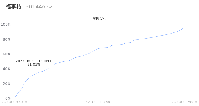 301446福事特2023年08月31日成交1.32万手,成交金额4554.97万元,相较昨日缩量7433手,换手率6.59%,成交清淡。